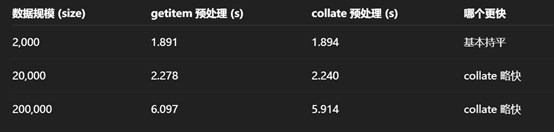 且从结果上看,collate 速率略快,该提升或许来源于更少的计算调用频率/调用开销